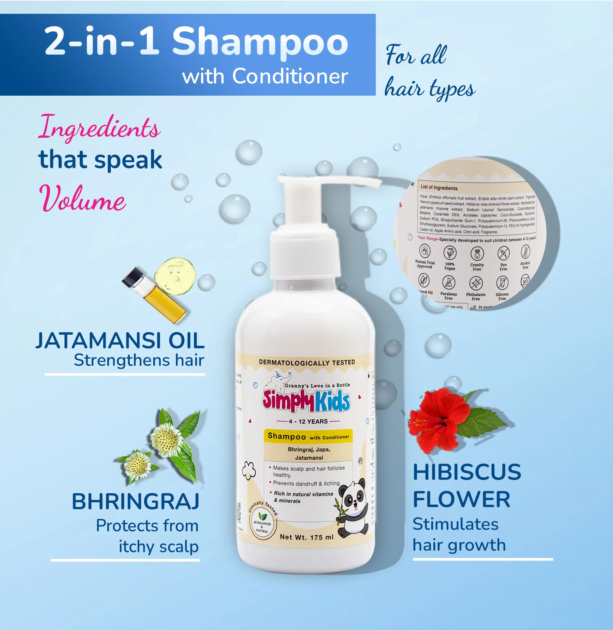 2 in 1 Shampoo with Conditioner: Aqua, Emblica officinalis fruit extract, Eclipta alba whole plant extract, Trigonella foenum-graecum seed extract, Hibiscus rosa-sinensis flower extract, Nardostachys jatamansi rhizome extract, Sodium Lauroyl Sarcosinate, Cocamidopropyl Betaine, Cocamide DEA, Acrylates copolymer, Coco-Glucoside, Glycerine, Sodium PCA, Biosaccharide Gum-1, Polyquaternium-39, Phenoxyethanol (and) Ethylhexylglycerin, Sodium Gluconate, Polyquaternium-10, PEG 40 Hydrogenated Castor oil, Apple Amino acid, Citric acid, Fragrance.