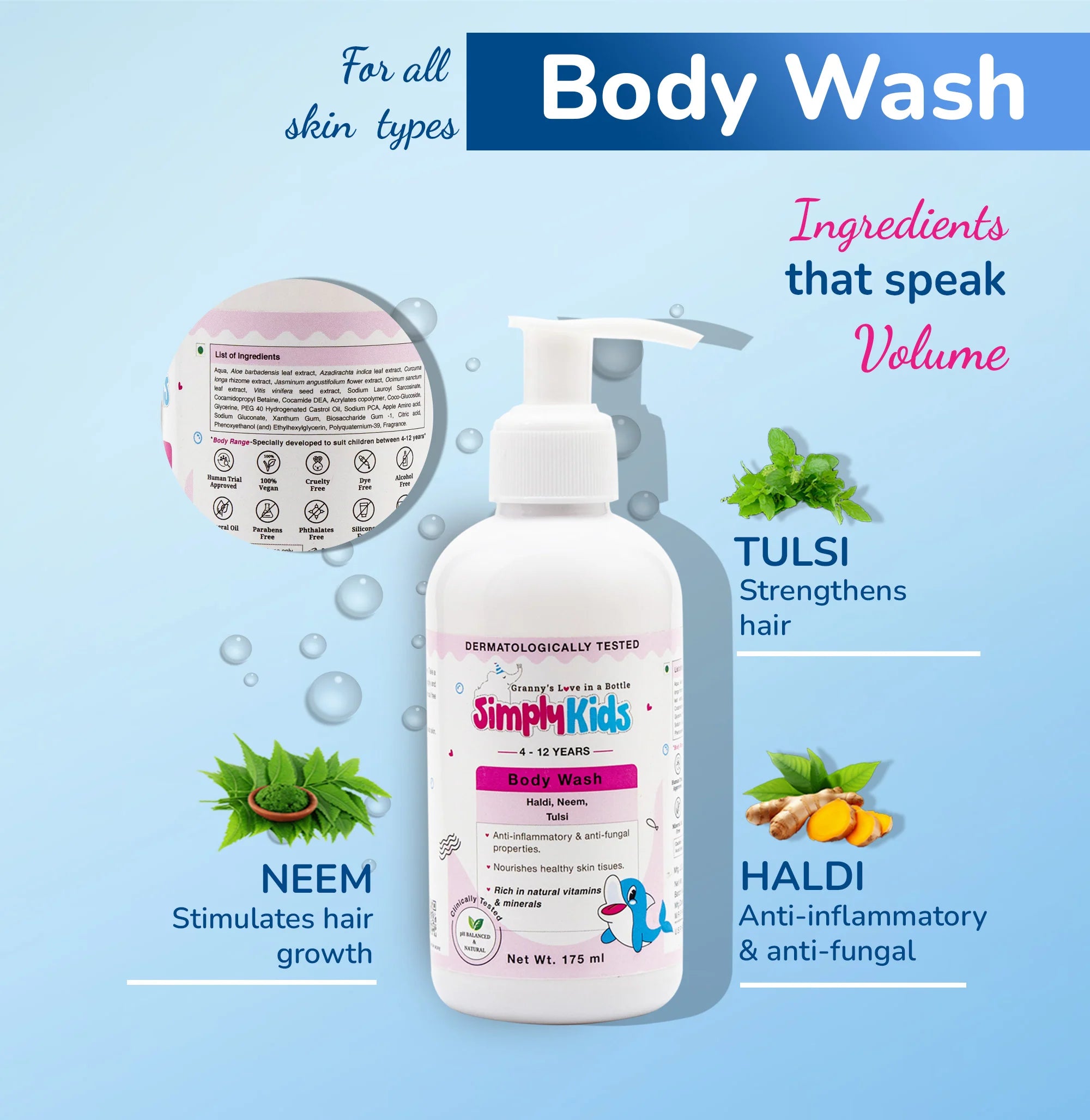 Body Wash: Aqua, Aloe barbadensis leaf extract, Azadirachta indica leaf extract, Curcuma longa rhizome extract, Jasminum angustifolium flower extract, Ocimum sanctum leaf extract, Vitis vinifera seed extract, Sodium Lauroyl Sarcosinate, Cocamidopropyl Betaine, Cocamide DEA, Acrylates copolymer, Coco-Glucoside, Glycerine, PEG 40 Hydrogenated Castor Oil, Sodium PCA, Apple Amino acid, Sodium Gluconate, Xanthum Gum, Biosaccharide Gum -1, Citric acid, Phenoxyethanol (and) Ethylhexylglycerin, Polyquaternium-39, Fragrance.